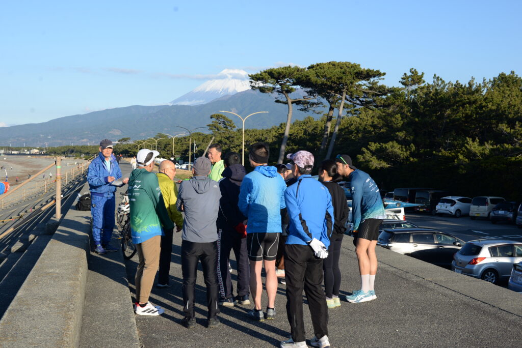 富士山を眺めつつ、新年の挨拶と準備体操。